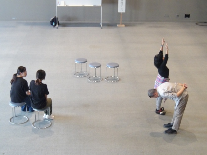 昨年の「コスモ舞台芸術アカデミー」で教えていただいた菅田真理子先生を講師に招いて開催しました。即興劇、インプロは互いの関係性・コミュニケーションが大事ということで、例えば、新法則を発見した数学博士役とインタビュアー役とのやりとりでは、イエスアンド(受け入れて話を続けていく姿勢)で話が展開していく回もありました。また、そのやりとりを聞いている二人が話に合わせて即興で表現ポーズを取り、変化させていく姿が続けられました。見ている側もイメージがふくらみました。
