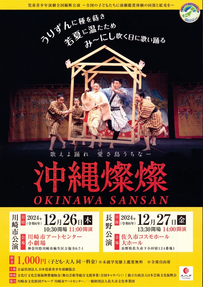 ~沖縄の心を舞台で~ 歌舞劇「沖縄燦燦」佐久公演 エネルギッシュな踊り、バイオリン、三線、パーカッションの生演奏と島々に伝わる古謡などを掘り出して創作された躍動感あふれるミュージカル。スコットランドの「エジンバラフリンジ演劇祭」で五つ星を獲得した舞台をお見逃しなく! ★ストーリーや見どころはエーシーオー沖縄のHPをご覧ください 日時:令和5年11月3日(祝・金) 開演:14:00(開場13:20) 会場:佐久市コスモホール ≪全席自由≫ 料金:2,000円(一般前売)1,000円(高校生以下前売) ※当日は500円増 ◎チケット販売場所(9/10~) ・佐久市コスモホール 0267-82-3962(休館日:月曜日・祝日の翌日) ・交流文化館浅科 0267-58-3304(休館日:月曜日・祝日の翌日) ・佐久平交流センター 0267-67-7451(休館日:毎月第1・3水曜日) ・佐久市望月支所 0267-53-3111(土日祝休み) ・ヒオキ楽器佐久平店 0267-68-7703(月曜定休) ・ ☆11月2日(木)には出演者によるワークショップを開催! 詳細はこちらをご覧ください。